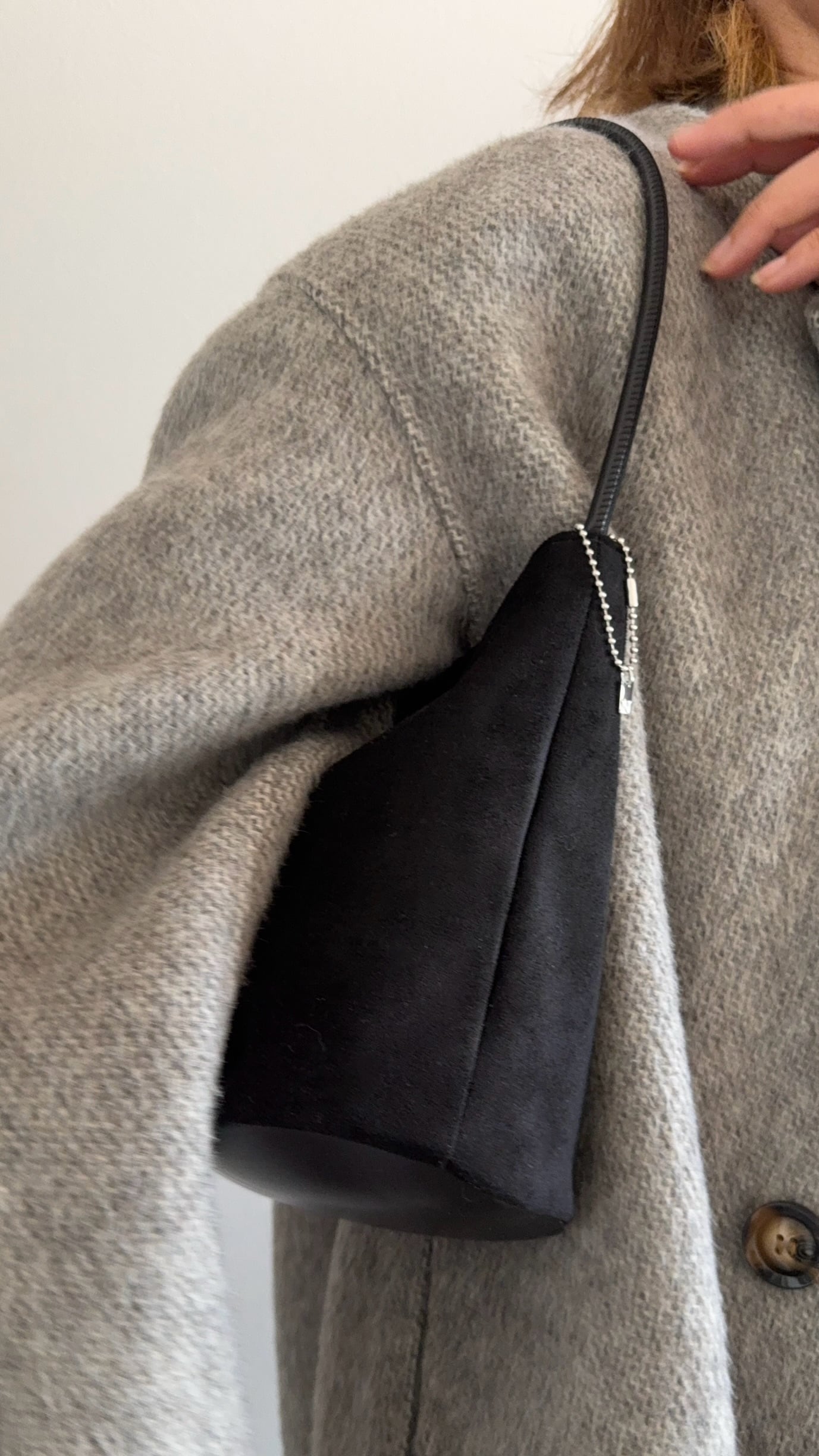 張りのあるレザーのワンハンドルなのでサッと持ちやすいのも特徴。絶妙な長さで肩掛けも可能。